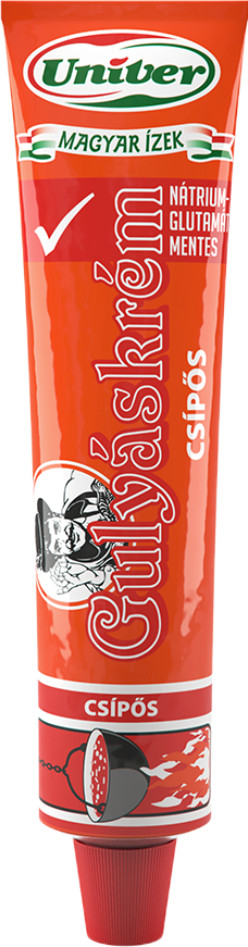 ‣Összetevők: paprikakrém (nyers édes és erős fűszerpaprika, pritaminpaprika, étkezési só, módosított keményítő, sűrítőanyag: xantángumi, étkezési sav: citromsav, tartósítószer: kálium-szorbát), sűrített paradicsom, vöröshagymakrém (vöröshagyma, étkezési só, finomított napraforgó-étolaj, módosított keményítő, étkezési sav: citromsav, tartósítószerek: kálium-szorbát, kálium-metabiszulfit, sűrítőanyag: xantángumi), finomított napraforgó-étolaj, étkezési só, cukor, fűszer- és zelleraroma, sűrítőanyag (xantángumi), babérlevél, tartósítószer (kálium-szorbát).
